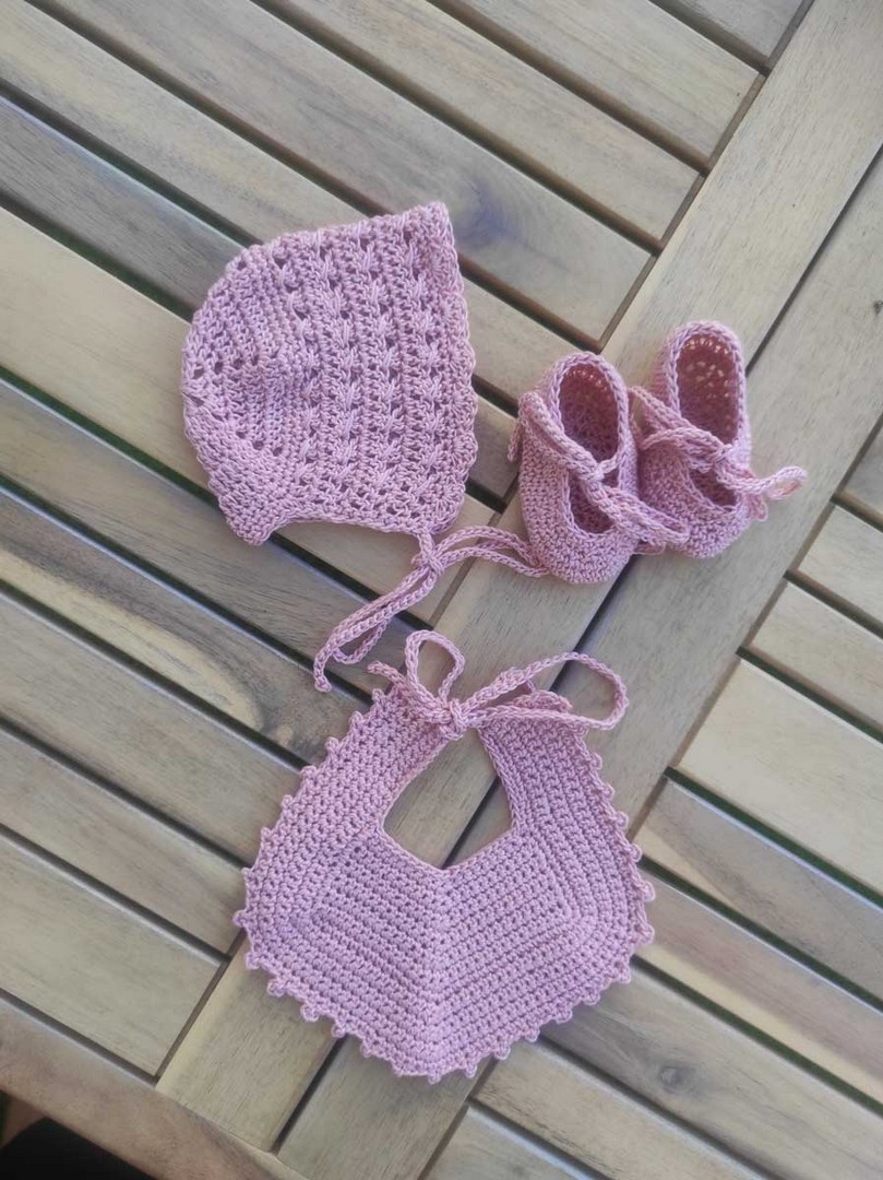 Conjunto capota , zapatitos y babero por encargo. 100% algodón. Croché. Elige tu color .